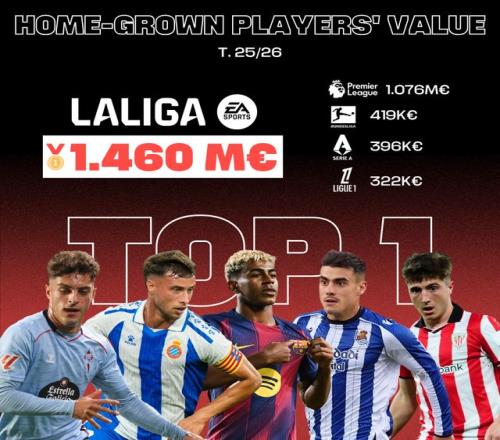 · 西甲联盟在青训人才价值与发展前景方面领跑欧洲,本土培养的球员总市场价值达14.6亿欧元,出场总时长占比19.8%,其可持续且极具竞争力的发展模式愈发稳固。 · 西班牙足球发展模式的国际需求持续增长,来自欧洲、亚洲及美洲的多个联赛与协会已向西甲联盟寻求在青训发展方面的咨询与培训合作。 马德里,2025年10月28日– 西甲联盟近日发布了一份关于旗下俱乐部青训体系及本土培养球员的经济与竞技价值分析报告。报告显示,西甲青训球员身价呈稳步上升趋势,以14.6亿欧元的总市场价值领跑欧洲其他顶级联赛。同时,西甲联盟也是本土青训人才使用率最高的联赛。2024/25赛季,俱乐部青训出身球员的出场时间占比达19.8%,该数据同样位居欧洲首位。