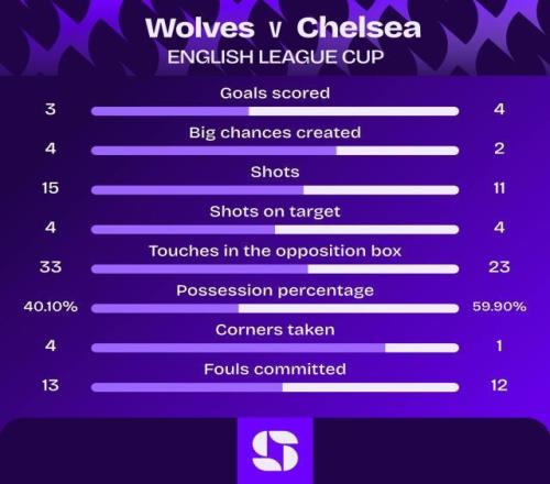 体坛周报全媒体原创 狼队3比4切尔西 48'阿罗科达雷,73'沃尔费,90+1'沃尔费/5'安德雷·桑托斯,15'泰里克·乔治,41'埃斯特旺,89'吉滕斯 英格兰联赛杯第4轮,切尔西客场挑战新赛季英超仍未尝胜绩的狼队。上半场安德雷·桑托斯、泰里克·乔治、埃斯特旺先后进球。下半场狼队连追两球,德拉普两黄变一红。终场前吉滕斯进球,沃尔费再追一球,切尔西4比3有惊无险战胜狼队,下一轮将客战卡迪夫城。