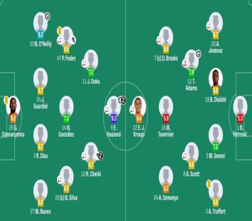 【出场阵容】 曼城首发:25-多纳鲁马、27-努内斯、3-迪亚斯、24-格瓦迪奥尔、33-奥赖利、14-尼科、20-B席(90'21-努里)、47-福登(90'16-罗德里)、10-谢尔基(73'4-赖因德斯)、11-多库(73'26-萨维尼奥)、9-哈兰德(82'7-马尔穆什)  |