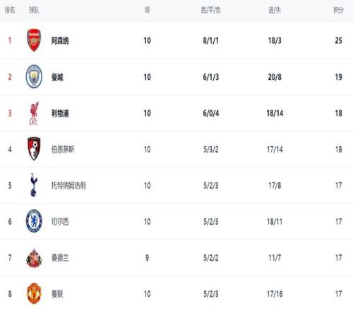 曼城赢下这场比赛之后排名升到了第2。曼城的战绩是6胜1平3负,拿到19分。而18个积分的利物浦掉到了第3名。第4的是伯恩茅斯,拿到18分。热刺、切尔西、桑德兰和曼联都是17分。曼联因为净胜球劣势,只能排名第8。曼联的排名虽然看起来很靠后,但实际上只比第2名的曼城少2分而已。 |