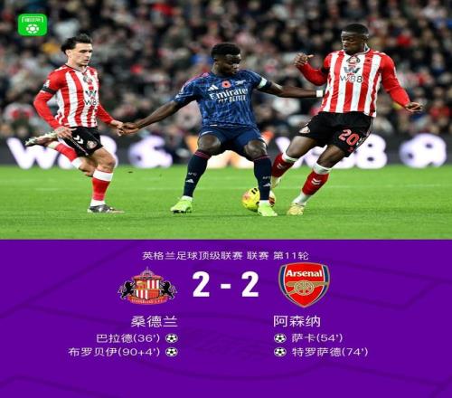 北京时间11月9日1:30,英超第11轮继续进行,阿森纳作客光明球场挑战桑德兰,本场主裁判为克雷格-鲍森。上半场,穆杰莱助攻巴拉德破门。下半场,梅里诺助攻萨卡扳平比分,特罗萨德世界波助阿森纳反超;补时阶段,布罗贝伊高难度凌空破门绝平。最终,阿森纳客场2-2战平桑德兰,各项赛事十连胜遭终结。 关键事件
