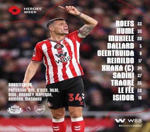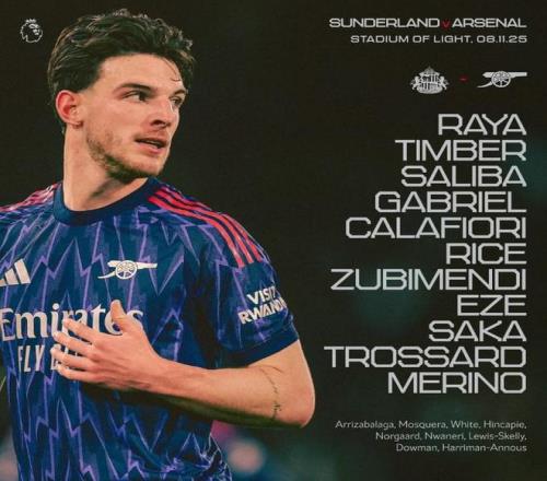 阿森纳首发:1-戴维-拉亚、12-廷贝尔、2-萨利巴、6-加布里埃尔、33-卡拉菲奥里、41-赖斯、36-苏比门迪、10-埃泽、7-萨卡、19-特罗萨德、23-梅里诺 桑德兰首发:22-罗埃夫斯、32-休姆、20-穆杰莱、5-巴拉德、6-海特勒伊达、17-雷尼尔多、34-扎卡、27-萨迪基、25-伯特兰-特拉奥雷、28-勒费埃、18-伊西多尔