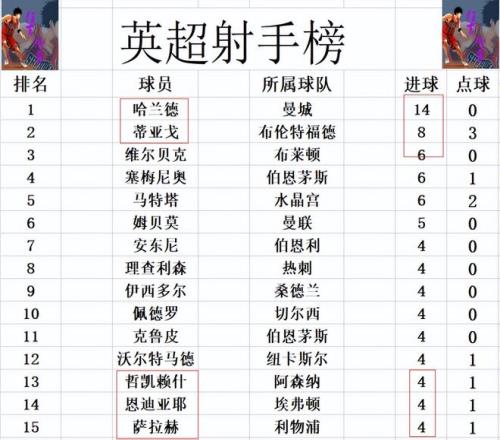 射手榜方面,哈兰德今天虽然失点,但最后也打入了一球,14球继续稳居榜首。蒂亚戈梅开二度,超过塞梅尼奥2球独居第2,落后榜首的哈兰德6球。维尔贝克,塞梅尼奥,马特塔6球并列第3。萨拉赫无力破门,还是和理查利森,哲凯赖什等人4球刚好挤入前十。 |