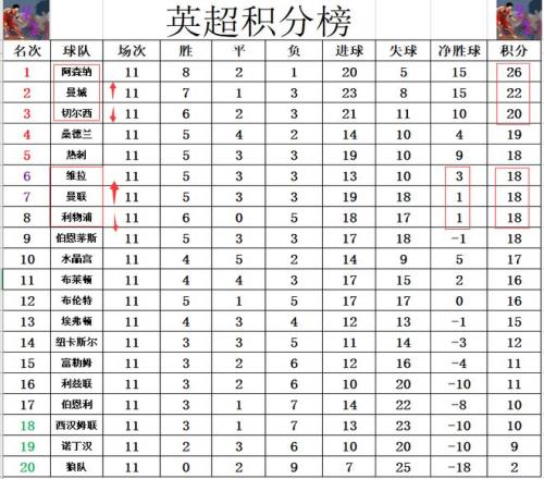 积分榜方面,阿森纳26分依然是高居榜首,曼城大胜利物浦后再次开启连胜模式,超过切尔西2分重回前2,落后榜首的阿森纳4分。惨败的利物浦被大胜的维拉超过,因为输的太多,还被曼联躺着超过,从第6继续下跌,已经是跌到第8了。