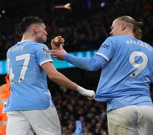 此役主场对阵利物浦,在比赛第63分钟多库打入球队第三球时,一个苹果从看台上扔了下来。 图片显示,福登拿起苹果咬了一口,哈兰德也拿过苹果来咬了一口。这成为这场紧张、刺激的焦点战期间的有趣一幕。