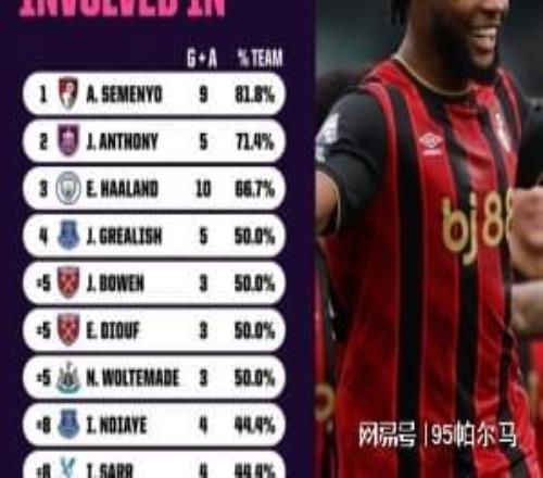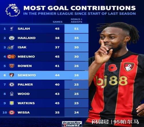 “进球和助攻上双是我的新目标之一。”这是塞梅尼奥新赛季开打之前的愿望,事实上他在本赛季12场各项赛事中已经制造了9粒进球,个人参与进球数占球队总进球数的81.8%,这个权重位居英超第一。 最高光的瞬间莫过于在安菲尔德遭遇种族歧视之后,上演了梅开二度的好戏,即使伯恩茅斯吃了败仗,塞梅尼奥虽败犹荣,值得一提的是,他也是自2022年9月以来,第一位在英超客场对利物浦完成双响的球员。