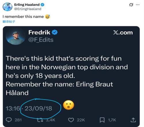 网友7年前盛赞一位挪威天才,哈兰德社媒转发:我记得他的名字