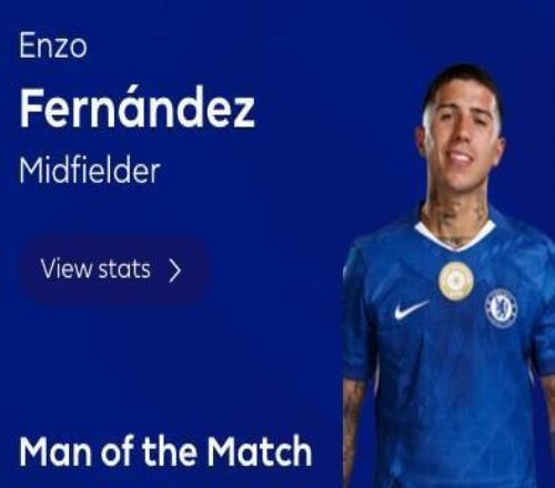 英超第12轮,切尔西客场2-0击败伯恩利,此役打入一球的恩佐当选英超官方全场最佳球员。