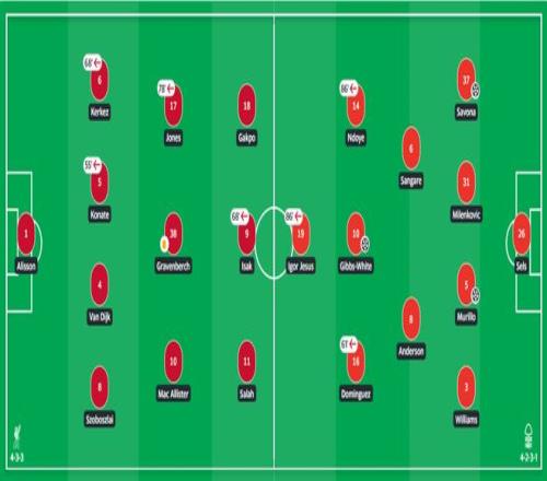 下半场开始仅39秒,前利物浦后卫内科·威廉姆斯左路突破后回传,尼古洛·萨沃纳轻松推射得分。这个进球彻底打乱了利物浦的节奏。 第78分钟,奥马里·哈钦森切入禁区劲射,阿利松扑救脱手,摩根·吉布斯-怀特补射空门得手,锁定胜局。