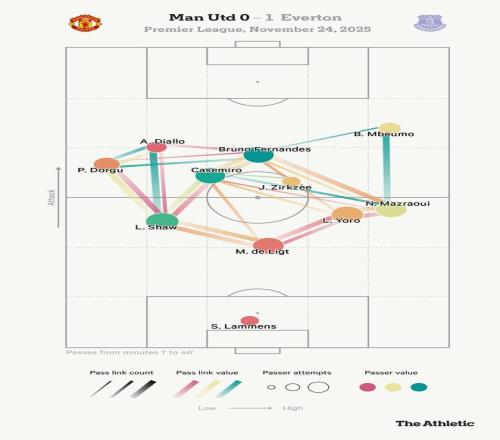 中场休息时,阿莫林用梅森-芒特换下马兹拉维,并将阿马德从前腰位置调整到右翼卫。芒特立即融入比赛,他的射门被挡出,随后一次头球攻门也偏出。在姆伯莫低射考验了皮克福德之后,芒特还以一记弧线球射门险些得分。 比赛未到60分钟,阿莫林用因伤错过对阵热刺比赛的梅努换下卡塞米罗,并派上迪奥戈-达洛特替下多古。 曼联在比赛尾声阶段加强了压力,梅努为齐尔克泽送出传中,但后者在绝佳位置将头球顶偏。 阿莫林将肖推到左翼卫位置以利用其传中能力,并用德利赫特与约罗进行了换位。德利赫特从右中卫位置前插,为齐尔克泽送出一记精妙传中,后者的头球被皮克福德托出横梁。 曼联全场射门数以25比3领先埃弗顿,其中包括4次绝佳机会(埃弗顿为0次)。他们的预期进球总数为1.66,而埃弗顿为0.23。但是,他们在比赛大部分时间里,面对一支将近80分钟少一人作战的球队却显得步履维艰,最终导致了一场极具破坏性的失利。