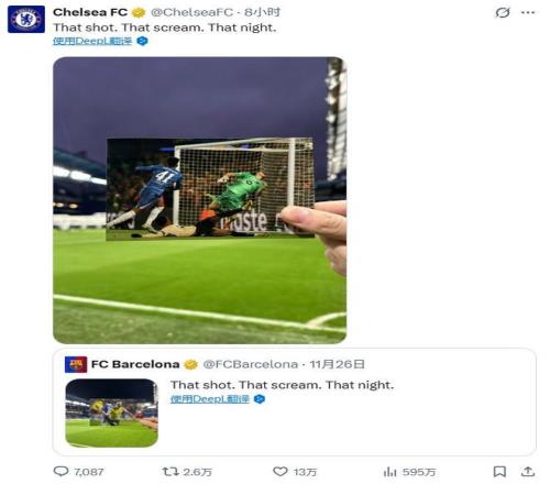巴萨赛前发小白当年绝杀照,切尔西赛后用埃斯特旺破门照回应