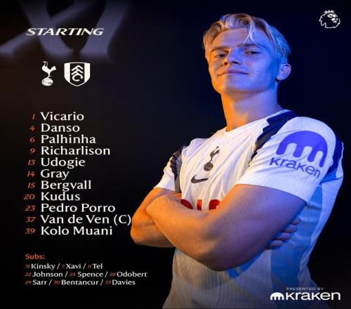 球员名单 热刺首发:1-维卡里奥、23-波罗、4-丹索、37-范德芬、13-乌多基、6-帕利尼亚、14-阿奇-格雷、15-贝里瓦尔、20-库杜斯、9-里沙利松、39-穆阿尼
