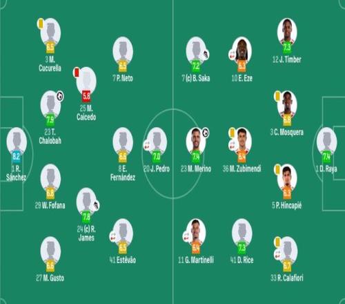 【出场阵容】 切尔西首发:1-桑切斯、27-古斯托、29-福法纳、23-查洛巴、3-库库雷利亚、24-詹姆斯、25-凯塞多、41-埃斯特旺(46'49-加纳乔)、8-恩佐、7-内托、20-佩德罗(55'9-德拉普) 替补未出场:12-约恩森、34-阿奇姆彭、4-阿达拉比奥约、5-巴迪亚希勒、17-桑托斯、10-帕尔默、11-吉滕斯 阿森纳首发:1-拉亚、12-廷贝尔、3-莫斯克拉、5-因卡皮耶、33-卡拉菲奥里(46'49-斯凯利)、36-苏比门迪(67'8-厄德高)、41-赖斯、10-埃泽(72'14-哲凯赖什)、7-萨卡、11-马丁内利(67'20-马杜埃凯)、23-梅里诺 替补未出场:13-凯帕、4-本-怀特、16-诺尔高、22-恩瓦内里、9-热苏斯 |