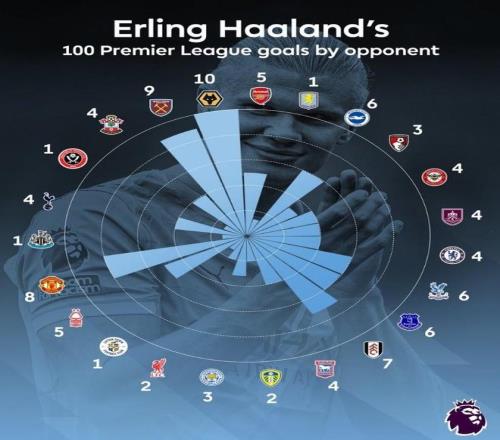 对手方面,哈兰德堪称“狼队克星”,6次交锋打入10球,仅用21次射门,平均每射门预期进球高达0.57。此外,他对西汉姆联(9球)、曼联(8球)和富勒姆(7球)也屡有斩获。效率最高的对手是伊普斯维奇,上赛季两场攻入4球。目前他对阵过的所有英超球队均有进球,仅对纽卡、维拉、卢顿和谢菲联四队各入1球。 自哈兰德登陆英超以来,同期进球数能达到他一半的球员仅有三位:萨拉赫(70球)、伊萨克(55球)和沃特金斯(51球)。本赛季他延续高效,14场联赛已攻入15球,有望成为英超首位单赛季突破40球的射手。