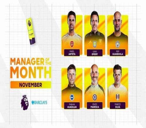 英超官方公布了11月最佳主教练候选名单,马雷斯卡、瓜迪奥拉、阿尔特塔、埃梅里等人在列。