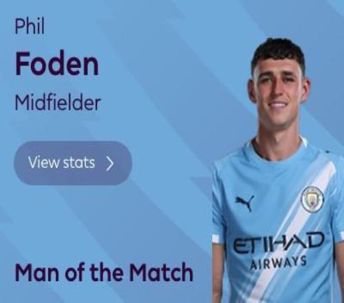 英超第15轮,曼城主场3-0大胜桑德兰,此役传射建功的福登当选全场最佳球员。