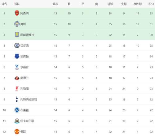 在积分榜上,阿森纳总积分依然是33分,排名榜首,但是优势已经所剩无几了。曼城赢球之后,总积分达到31分,排名第2,只比阿森纳少2分。阿斯顿维拉30分排名第3。第4的是切尔西,拿到25分。埃弗顿24分排名第5。水晶宫、桑德兰和利物浦都是23分。 |