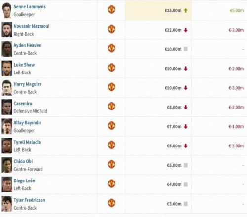 姆伯莫 7500万(上涨500万) 谢什科 6000万(下跌1000万) 阿马德-迪亚洛 5000万(上涨1000万) 梅努 4000万(下跌500万) 布鲁诺-费尔南德斯 4000万(下跌500万) 德利赫特 4000万(上涨200万) 芒特 3200万(上涨400万) 多古 3000万(上涨500万) 乌加特 3000万(下跌500万) 齐尔克泽 2500万(下跌300万) 拉门斯 2500万(上涨500万) 马兹拉维 2200万(下跌300万) 卢克-肖 1000万(下跌200万) 马奎尔 1000万(下跌300万) 卡塞米罗 800万(下跌200万) 巴因迪尔 700万(下跌100万) 马拉西亚 500万(下跌300万) 希顿 15万(下跌5万) (注:榜单中未列及的球员维持原身价,本期身价没有更新) 【上咪咕独家看英超】 |
