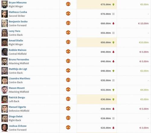 曼联球员身价变动:B费下跌至4000万欧,阿马德迪亚洛上涨1000万欧