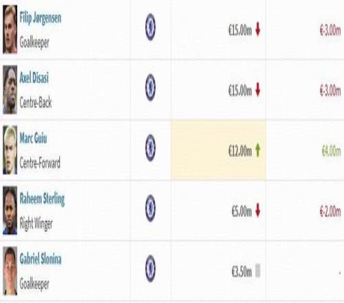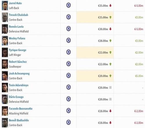 切尔西球员身价变动:埃斯特旺上涨2000万欧,德拉普下跌500万欧