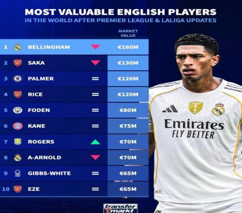 1. 贝林厄姆(皇家马德里) 1.6亿欧元 2. 萨卡(阿森纳) 1.3亿欧元 3. 帕尔默(切尔西) 1.2亿欧元 4. 赖斯(阿森纳) 1.2亿欧元 5. 福登(曼城) 8000万欧元 6. 哈里-凯恩(拜仁慕尼黑) 7500万欧元 7. 摩根-罗杰斯(阿斯顿维拉) 7000万欧元 8. 亚历山大-阿诺德(皇家马德里) 7000万欧元 9. 吉布斯-怀特(诺丁汉森林) 6500万欧元 10. 埃泽(阿森纳) 6500万欧元 【上咪咕独家看英超】 |