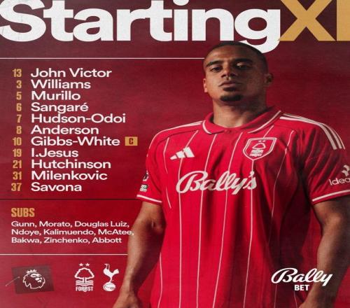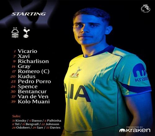 热刺首发:1-维卡里奥、17-罗梅罗、37-范德芬、23-波罗、24-斯彭斯、30-本坦库尔、14-阿奇-格雷、7-西蒙斯、39-穆阿尼、20-库杜斯、9-里沙利松 替补:31-金斯基、4-丹索、6-帕利尼亚、11-特尔、15-贝里瓦尔、22-布伦南-约翰逊、28-奥多贝尔、29-萨尔、33-本-戴维斯 诺丁汉森林首发:13-约翰-维克托、3-内科-威廉斯、5-穆里略、31-米伦科维奇、37-萨沃纳、6-桑加雷、8-埃利奥特-安德森、21-哈钦森、10-吉布斯-怀特、7-奥多伊、19-伊戈尔-热苏斯 替补:18-冈恩、4-莫拉托、35-津琴科、44-阿博特、12-道格拉斯-路易斯、24-麦卡蒂、14-恩多耶、15-卡利穆恩多、29-巴夸