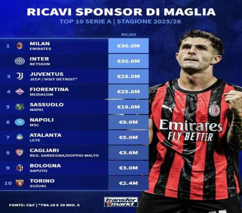 意甲TOP10 球衣赞助收入(2025/26)1 AC米兰 赞助商:Emirates 赞助金额:3000万欧元(人民币:2.46亿元) 2 国际米兰 赞助商:Betsson 赞助金额:3000万欧元(人民币:2.46亿元) 3 尤文图斯 赞助商:Jeep / Visit Detroit 赞助金额:2800万欧元(人民币:2.30亿元) 4 佛罗伦萨 赞助商:Mediacom 赞助金额:2500万欧元(人民币:2.05亿元) 5 萨索洛 赞助商:Mapei 赞助金额:1800万欧元(人民币:1.48亿元) 6 那不勒斯 赞助商:MSC 赞助金额:900万欧元(人民币:7386.12万元) 7 亚特兰大 赞助商:Lete 赞助金额:500万欧元(人民币:4103.40万元) 8 卡利亚里 赞助商:Reg. Sardegna / Doppio Malto 赞助金额:360万欧元(人民币:2954.45万元) 9 博洛尼亚 赞助商:Saputo 赞助金额:300万欧元(人民币:2462.04万元) 10 都灵 赞助商:Suzuki 赞助金额:240万欧元(人民币:1969.63万元)