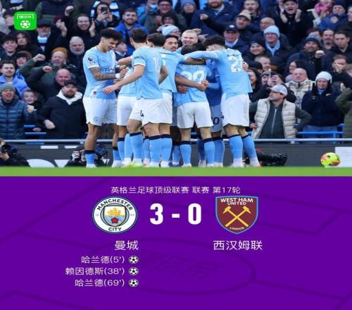 北京时间12月20日,英超联赛第17轮展开较量,曼城坐镇主场迎战西汉姆联。上半场,哈兰德传射建功,赖因德斯小角度劲射破门扩大领先;下半场,西汉姆联攻势一度有起色,鲍恩屡造威胁,但哈兰德抽射破门锁定胜局。最终,曼城主场3-0完胜西汉姆联,先赛一场暂登英超榜首。 关键事件 第5分钟,哈兰德射门被扑后自己补射破门,曼城1-0西汉姆联!