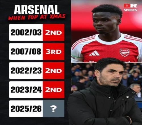阿森纳第5次成为英超圣诞冠军 英超 12-21 12:25 阿森纳1比0小胜阿尔特塔老东家埃弗顿,继续领先曼城2分领跑英超积分榜。这是阿森纳第5次以圣诞冠军身份领跑,然而前4次都没能最终夺冠(2002-03亚军、2007-08季军、2022-23亚军、2023-24亚军),其中前2次是被曼联逆转夺冠,后2次是被曼城逆转夺冠。 若算上老英甲时代,枪手还有3次成为圣诞冠军却没能最终捧起奖杯,分别是1951-52季军、1986-87殿军、1989-90殿军。