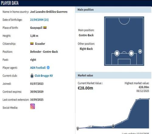 随队斯蒂尔冬窗的文章提到了中卫了,新赛季以来小道消息讨论个把月的布鲁日中卫奥多涅斯Joel Ordóñez赫然在列,搬一个Joel Ordóñez的集锦吧。 【唯一的非主流联赛目标】 奥多涅斯,2004年出生,厄瓜多尔中卫,身高188cm+,效力于比利时联赛布鲁日,右脚球员,除了踢中卫,也客串过右后卫。虽然说奥多涅斯是昨晚斯蒂尔列了一堆冬窗绯闻中卫名字里唯一不在主流联赛里的小年轻(21),但上半年斯蒂尔写夏窗转会预计的时候就有提过一次,利物浦俱乐部层面派去球探到比甲布鲁日观察其实也有一个自然年了。 【替科纳特的长期储备?】 我个人猜测他会是冬窗比较可能的一个中卫目标,其定位是科纳特不续约的可能替身与右中卫位置的长期储备,当然要引援满足的条件是必须腾出一个外援名额(卖掉远藤航?拉姆塞?)。此外,格伊的转会并未尘埃落定,同样夏季主力级别的中卫引援计划在新援是左是右上爱家门我估计会有比较长久的评估与衡量,这对冬窗是否提前或者应急购入一个中卫的决定有非常大的影响。