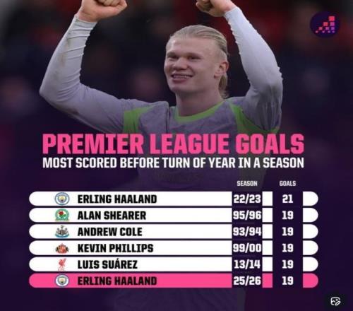 12月31日讯 2025年英超战罢,数据网站OPTA也盘点了英超历史在新年之前射手榜,其中本赛季哈兰德19球并列次席,纪录也由自己保持。 哈兰德(曼城) 22/23赛季 21球 阿兰·希勒(布莱克本)95/96赛季 19球 安德鲁·科尔(纽卡) 93/94赛季 19球 凯文·菲利普斯(桑德兰)99/00赛季 19球 苏亚雷斯(利物浦)13/14赛季 19球 哈兰德(曼城)25/26赛季 19球 今日(1.1) 08:00 NBA常规赛 鹈鹕 - 公牛 08:00 NBA常规赛 尼克斯 - 马刺 08:30 NBA常规赛 掘金 - 猛龙 09:00 NBA常规赛 奇才 - 雄鹿 09:00 NBA常规赛 开拓者 - 雷霆 19:35 CBA常规赛 江苏 - 宁波 19:35 CBA常规赛 北京 - 广东 19:35 CBA常规赛 四川 - 福建 19:35 CBA常规赛 天津 - 广厦 19:35 CBA常规赛 浙江 - 青岛 23:00 英冠第25轮 查尔顿 - 考文垂 23:00 英冠第25轮 南安普顿 - 米尔沃尔 明晨(1.2) 00:00 足球友谊赛 中国男足U23 - 伊朗U23 01:30 英超第19轮 水晶宫 - 富勒姆 01:30 英超第19轮 利物浦 - 利兹联 01:30 英冠第25轮 谢菲尔德联 - 莱斯特城 04:00 英超第19轮 布伦特福德 - 热刺 04:00 英超第19轮 桑德兰 - 曼城 07:00 NBA常规赛 火箭 - 篮网 |