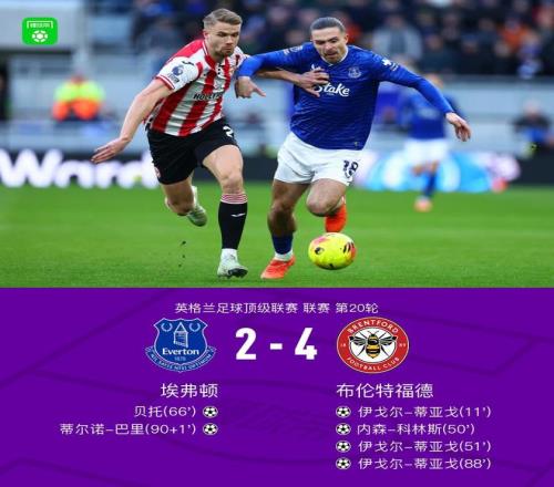 北京时间1月4日,英格兰足球超级联赛第20轮,埃弗顿坐镇主场迎战布伦特福德。比赛中,布伦特福德前锋伊戈尔-蒂亚戈完成帽子戏法,内森-科林斯建功。埃弗顿方面,格拉利什助攻双响,贝托、蒂尔诺-巴里破门。最终全场战罢,埃弗顿以2比4不敌布伦特福德。 关键事件 第11分钟,先拔头筹,伊戈尔-蒂亚戈抢点破门,布伦特福德1-0领先