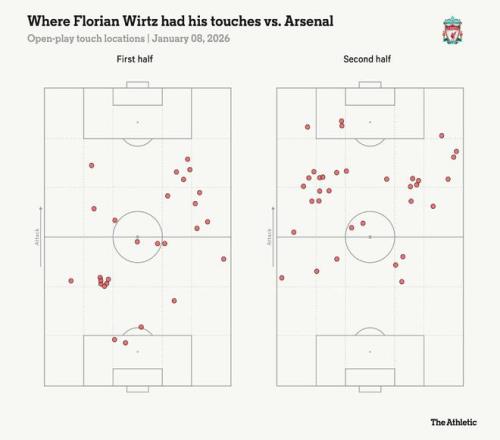随着阿森纳早期掌控力的松动,利物浦逐渐进入比赛状态,在下半场主导了球权。这部分源于阿森纳似乎满足于退守保住平局,同时维尔茨也发挥了更大影响力,他回撤更深并在球场游弋,与索博斯洛伊完成流畅配合。在一次干净利落的盘带后被特罗萨德阻挡身体,他甚至可能觉得自己未能赢得点球有些遗憾。 在没有正统中锋的情况下,利物浦进攻乏力并不意外,仅创造0.36的预期进球,为赛季新低。但通过让维尔茨远离其不熟悉的前锋位置,其中场的串联配合至少帮助利物浦重获一定控制力,并拿到了一分——这在赛前是许多人未曾预料到的,无疑提升了士气。