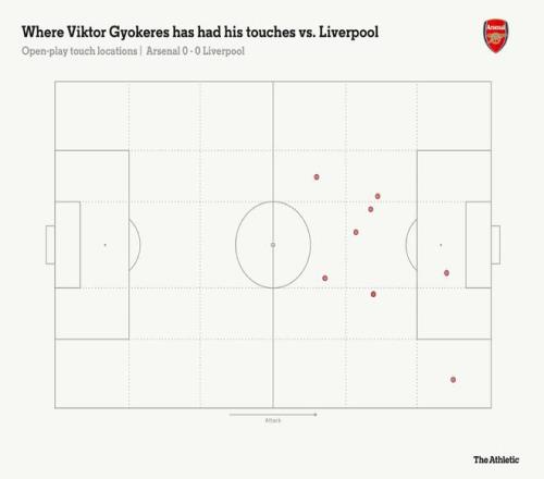25分钟后,利物浦形势严峻,难以摆脱阿森纳的持续压制。他们以弗洛里安-维尔茨出任伪九号(触球热图如下所示),辅以弗林蓬和加克波的两翼,缺乏明确的出球点来缓解压力。