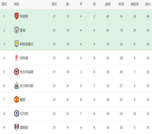 阿森纳虽然只拿到一场平局,但依然占据了榜首位置。阿森纳21轮狂揽49分排名第1,身后的曼城和阿斯顿维拉都是43分。也就是说,阿森纳有6分的优势,依然是夺冠最大热门。而利物浦则落后有点多了,只拿到35分,排名第4。事实上,利物浦第4的位置并不稳,与身后的球队差距很小。 |