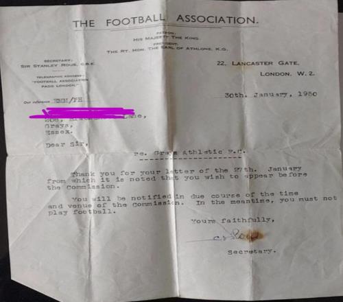 我爷爷曾为格雷斯竞技队效力。 那时候,格雷斯竞技还是一支业余球队。当时英格兰足球协会的规定是,职业球队可以给球员支付薪水,但业余球员不得接受任何报酬。 显然,业余球队的做法相当狡猾——当你去淋浴时,一个装着钱的小信封会“神奇地”出现在你的足球靴里,这也就是所谓的“靴钱”。 长话短说,格雷斯竞技队被怀疑发放靴钱。这封信证实了我爷爷愿意参与委员会的调查。在调查结果出来之前,他被禁止参赛。 他去了委员会,报上了自己的名字,然后被问及是否知道靴钱一事,以及是否收到过靴钱。他否认了。他们向他表示感谢,然后禁赛了他(还有其他人)两年。 幸运的是,在那个年代,执行这样的禁赛并不现实,所以他就用化名加入了另一支球队。不过他曾开玩笑说,有时候人们大喊“约翰尼”时,他会感到困惑,因为他的名字并不是“约翰尼”。 【上咪咕独家看英超】 |