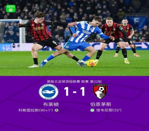 北京时间1月20日英格兰足球顶级联赛 联赛 第22轮,布莱顿主场对阵伯恩茅斯。上半场,阿德利造点,塔韦尼耶主罚命中。下半场最后时刻,范黑克助攻,科斯图拉斯倒钩绝平。全场比赛结束,布莱顿1-1伯恩茅斯。 关键事件 第33分钟,阿德利倒地,主裁改判点球,塔韦尼耶命中,伯恩茅斯1-0