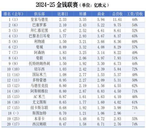 皇萨仁黎压制英超六强 皇马在2023-24赛季成为足坛首家年营收超过10亿欧元的豪门后,上赛季再创新高,达到11.6亿。商业营收对此起到决定性作用,5.94亿的惊人数字,已超过第10名切尔西的总营收。对比皇马自身,商业营收也在一年间就暴涨23%。 巴萨虽一直深受财政公平困扰,支出额度受限,但他们依然家底厚实,吸金能力超群。在上赛季仍未返回诺坎普比赛的情况下,他们的营收依然猛增27%,9.75亿欧元的成绩使他们自2019-20赛季以来首度重返金钱联赛三甲。增收的一大推动力,在于专属座位许可协议(球迷支付一笔费用,获得特定座位的长期专属权,但每年季票仍需额外购买)的推出,由此一次性进账约7000万。 皇马巴萨身后,拜仁和巴黎圣日耳曼保持着常年的稳定营收,分列三四名。“皇萨仁黎”外加曼城,是近年金钱联赛总体最稳定的第一集团成员。比较而言,英超大部队则常年垄断第二梯队。本年度,四大家族身后,5-10名刚好被英超“六强”包揽。 英超豪门的总体营收能力,与他们的竞技实力和球星档次非常吻合:一流但并非最顶尖。最好的俱乐部和最好的球员几乎从来不在英超,但他们拥有最庞大的“一流不顶尖”强队矩阵,以及“一流不顶尖”球星矩阵。同样,英超整体经济实力吊打其他联赛,但在头部俱乐部的竞争中,英超没有优势。 上赛季的英超冠军利物浦位列榜单第5,该队首次成为“金钱联赛英超冠军”。这主要得益于他们重返欧冠给转播收入带来的34%增幅,商业营收板块也上扬7%。 曼城从第2跌至第6,比起前一年度英超冠军+欧冠八强的成绩,蓝月上赛季大幅滑坡,欧冠甚至无缘16强。但其实,蓝月自身的营收业绩只有小幅下滑(8.38亿→8.29亿),无需忧虑。 该着急的或许是曼联。曾几何时,红魔是金钱联赛四强位置的钉子户,绝对的英超第一豪门。但本年度,他们下滑4名,仅列榜单第8,创金钱联赛29年历史中的最低纪录。其实,曼联自身营收从7.71亿还微增至7.93亿。但大部分竞争对手都在大步前进,曼联原地踏步注定落后。红魔商业开发潜力依然不容小觑,上赛季比赛日和商业两大板块增收7500万,但与成绩挂钩的转播收入连年下降,上赛季同比暴跌5200万。 稍微值得曼联球迷欣慰的,是该队“人傻钱多”的状况正在好转。至少,低能球员已不再耗去过高比例的工资支出。本年度,曼联工资总额为营收总额的51%,处于健康水平,而三四年前,这个数字还在65%以上。 在健康经营方面,典范同样是皇马。该队工资支出占营收的比值,从3年前的73%一路下调,而今这一数据仅为44%。作为反面教材,巴萨的情况也在大幅向好,4年前84%的营收用来发饷,而今只有54%。与巴萨走过类似路径的还有米兰双雄,国际米兰4年前83%的工资/营收比值,如今已降为48%。米兰则从78%来到46%。尤文图斯从78%降为61%,仍有改善空间。 工资把控不力的代表球队,则是英超六强之下的排头兵阿斯顿维拉和纽卡斯尔联。两队近年都取得了巨大成功,但这两家中档俱乐部终究营收能力不足。两队工资/营收比值同为71%,也就难怪他们都曾面临财政公平考核的巨大危机。由于品牌号召力与豪门存在本质差别,两队命门都在商业营收板块。他们都在为此努力,纽卡在被沙特资方收购后,商业营收每年跃升一个台阶,从4年前寒酸的2600万,一路上扬到5400万、9000万,直至今年的1.39亿。维拉也有着从2900万到8300万的跨越。然而,维拉纽卡在这一板块依然落后豪门两三个亿,注定他们在中短期未来,不可能成为真正的“大俱乐部”。