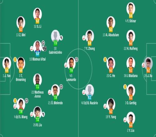 在北京时间8月15日晚结束的中超第21轮一场焦点战中,卫冕冠军上海海港坐镇主场4-1完胜河南队。上半场,王燊超破僵,维塔尔2传1射,刘若钒助攻+中框,莱昂纳多扩大优势。下半场,加布里埃尔助攻梅伦多打进加盟首球锁定胜局,维塔尔送点,卡多索主罚命中为河南扳回一城。 海港取得交手4连胜,连续12轮中超保持不败(9胜3平),21轮积47分,本轮先赛情况下,领先申花2分,暂时登顶。而河南队最近8轮仅1胜,其余7轮2平5负。21轮积19分,排名第12位。 【关键焦点】 第20分钟,维塔尔主罚任意球,河南防守漏人,无人盯防的王燊超头球破门,海港1-0河南。 第37分钟,刘若钒背身回敲,维塔尔禁区前沿一记贴地斩直钻网窝,海港2-0河南。 半场补时第4分钟,海港反击,刘若钒做球,维塔尔送出直塞,莱昂纳多单刀晃过徐嘉敏后推射空门得手,海港3-0河南。 第55分钟,加布里埃尔助攻,梅伦多中路包抄垫射破门,海港4-0领先河南。 第61分钟,维塔尔与纳萨里奥拼抢致后者禁区倒地,VAR介入,主裁场边回看后判点,卡多索点射破门,河南1-4扳回一城。 【精彩回放】 第4分钟,梅伦多分球,莱昂纳多转身射门被徐嘉敏封堵。 第10分钟,维塔尔角球传中,王燊超头球攻门弹地后偏出。 第40分钟,河南队险些破门,纳萨里奥任意球直接攻门,皮球击中门框弹出。 第42分钟,加布里埃尔反击远射,徐嘉敏飞身做出精彩扑救。 易边再战,第57分钟,何超犯规后,与梅伦多发生小冲突,主裁判上前制止。 第86分钟,阿奇姆彭左路快速反击,摆脱后一脚低射稍稍偏出。 【球员评分】 【数据统计】 【出场阵容】 上海海港首发(4-1-4-1) 门将:1-颜骏凌 后卫:4-王燊超(80'20-杨世元)、3-蒋光太、13-魏震、32-李帅 后腰:22-马修斯-茹萨(F) 中前卫:26-刘若钒(80'49-李新翔)、10-马特乌斯-维塔尔(F)(80'29-亚历斯祖)、21-梅伦多(F)(87'47-蒯纪闻)、30-加布里埃尔(F) 前锋:45-莱昂纳多(F)(89'14-李圣龙) 替补未出场:12-陈威、2-李昂、5-张琳芃、15-明天、23-傅欢、6-徐新、11-吕文君 河南队首发(4-2-3-1) 门将:26-徐嘉敏(46'18-王国明) 后卫:4-叶力江、3-周缘德、36-迈达纳(F)、2-刘易鑫(46'11-阿奇姆彭(F)) 后腰:20-何超、22-黄锐烽 中前卫:19-杨意林(65'6-王上源)、13-阿卜杜肉苏力、7-钟义浩(46'9-费利佩-卡多索(F)) 前锋:40-纳萨里奥(F)(73'10-黄紫昌) 替补未出场:15-刘斌、16-杨阔、17-何小珂、27-牛梓屹、29-郑达伦、30-刘鑫瑜、38-卢永涛 主裁判:万涛 VAR:戴弋戈 |