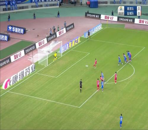 比赛开始。 上半场第22分钟,盐城队队长胡书铭利用点球机会,射进一球,为盐城队拿下1分。 第35分钟,南京队40号球员曹翰晨射进一球,将比分扳平到1:1。