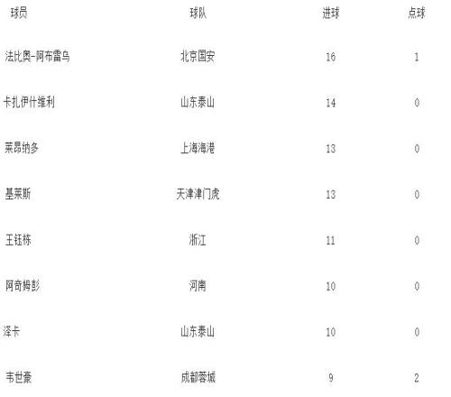 中超射手榜:法比奥领跑卡扎伊什维利14球位列第二