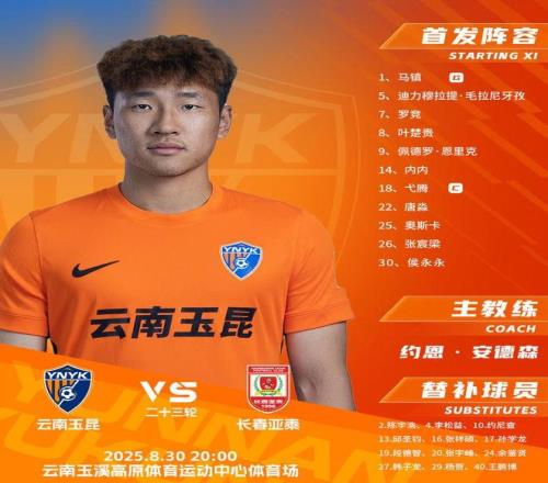 云南玉昆首发:1-马镇、5-迪力穆拉提、18-弋腾、22-唐淼、26-张宸梁、7-罗竞、8-叶楚贵、14-内内(F)、30-侯永永、9-佩德罗-恩里克(F)、25-奥斯卡(F) 长春亚泰首发:28-王智峰、2-阿不都海米提-阿不都格尼、4-罗西奇(F)、5-李申圆、15-徐浩峰、17-贺一然、6-张华晨、21-朴韬宇、27-胡安-卡米洛(F)、10-奥莫伊胡安弗(F)、29-谭龙