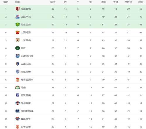 成都蓉城积50分,多赛一轮超越上海申花、北京国安,登上榜首位置,卫冕冠军上海海港跌至第四。此外,长春亚泰积16分,继续排名垫底,错失逃离降级区的机会。 |