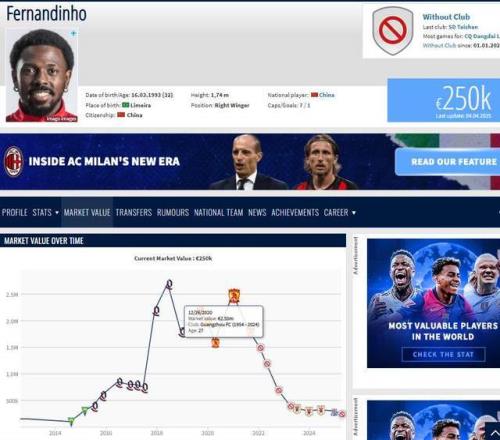 第二个,他的价值也跌到谷底。曾经在中国风头正盛时,费南多身价一度达到270万欧,如今根据德转数据,他只值25万欧,缩水超九成。如果再继续“失业”,恐怕很快就会被彻底遗忘。要知道,他在国足出场7次,还留下过1粒进球,但短短几年,竟然走到如此地步,确实让人唏嘘。