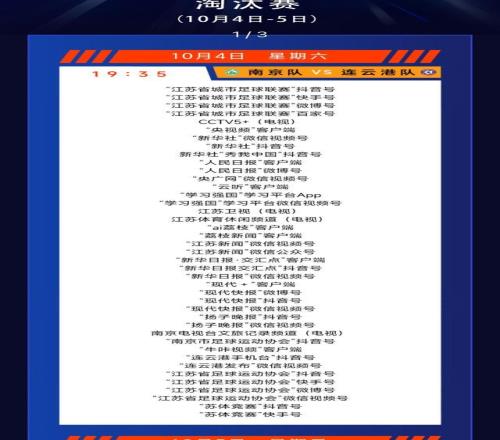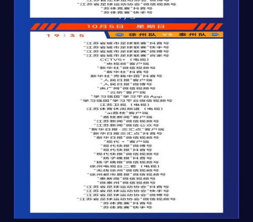 | 现代快报讯(记者 王卫)10月4日、5日、7日、8日,苏超八强淘汰赛将在国庆中秋双节假期期间激战四场。10月3日,苏超官方微信公众号发布了淘汰赛(10月4日-5日)转播计划表,现代快报记者注意到,10月4日晚南京对阵连云港、10月5日晚徐州对阵泰州的比赛,CCTV5+(电视)均转播。记者了解到,这是央视电视端首次直播苏超赛事。