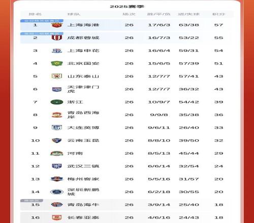 中超积分榜:山东泰山回升第五,海牛深陷降级区