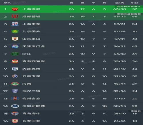 中超最新积分榜:上海双雄+蓉城争冠,最后四轮谁赛程占优