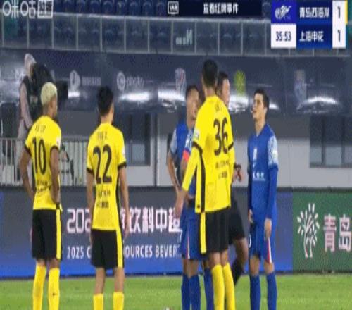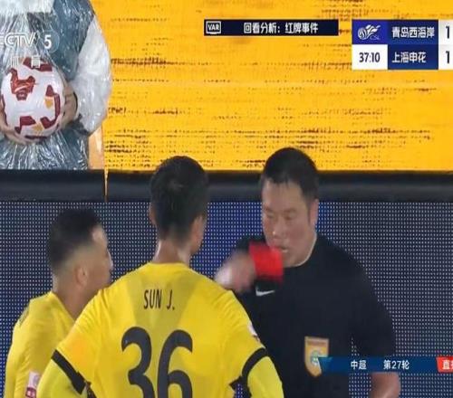 第37分钟,孙捷飞踹于汉超,这个动作太危险了!VAR介入,裁判向孙捷出示红牌,西海岸10人应战!