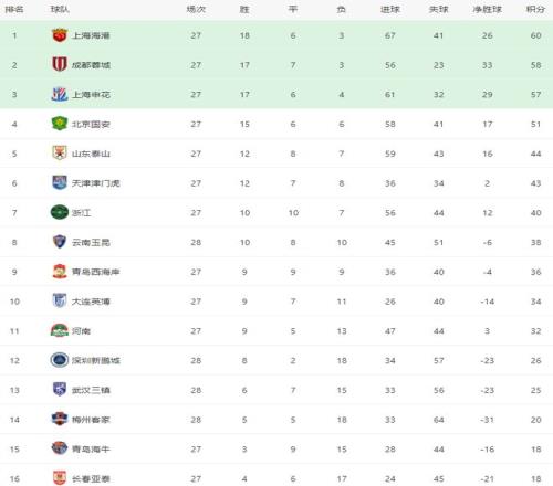 在积分榜上,上海海港以60分排名榜首。成都蓉城紧随其后,拿到58分。上海申花以57分排名第3。冠军的争夺还是非常激烈。虽然上海海港占据优势,但接下来的比赛不容有失,一旦丢分很可能就被挤下去。而保级形势也是比较乱。深圳新鹏城26分基本保级成功。武汉三镇25分排名第13。梅州客家拿到20分,排名倒数第3。长春亚泰以19分排名倒数第2。倒数第1的是青岛海牛,少踢1场,拿到18分。 |