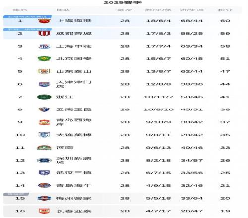 随着泰山31掀翻海港,中超最新积分榜:蓉城22绝平无缘重返榜首